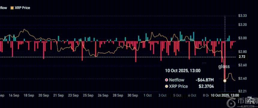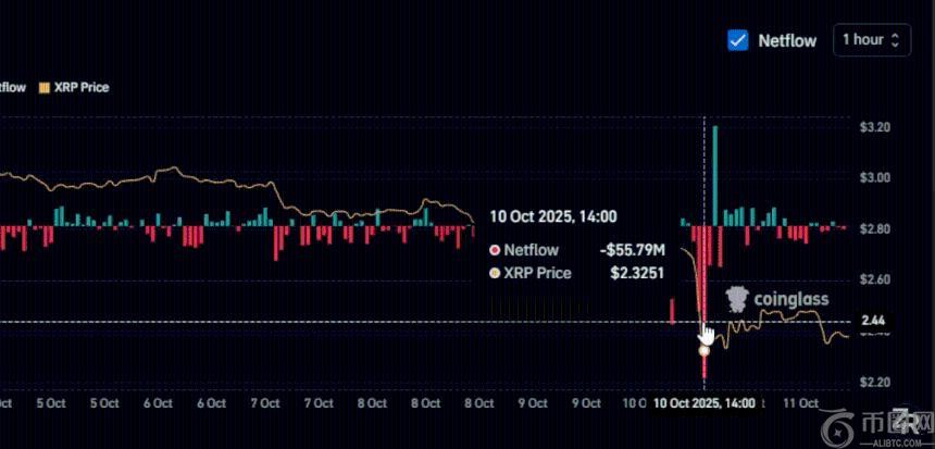 值得注意的是,10月10日的暴跌凸显了这种差异。尽管交易所流量数据好坏参半,但XRP在10月11日至13日期间连续三天上涨,显示出交易流量数据与价格走势之间的不一致性。