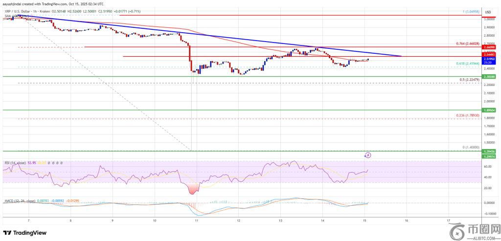 XRP 价格正试图在 2.50 美元区域上方形成复苏浪潮。 目前价格高于 2.50 美元和 100 小时简单移动平均线。 XRP/USD 对的小时图上形成了一条关键的看跌趋势线,阻力位在 2.60 美元(数据来源于 Kraken)。 如果突破 2.60 美元的阻力位,该货币对可能会开始新一轮的上涨。XRP 价格即将飙升?
