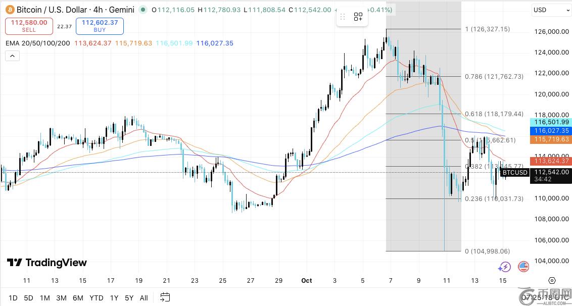 从 126,327 美元回撤至 104,998 美元的回调位定义了关键的斐波那契水平,目前这些水平将指导比特币的短期走势。位于 110,031 美元的 0.236 美元回调位是直接支撑位,而位于 113,445 美元的 0.382 美元回调位则限制了大多数日内反弹。115,662 美元区域与 50 日指数移动平均线重合,代表着一个可能决定比特币下一步走势的中期枢轴点。