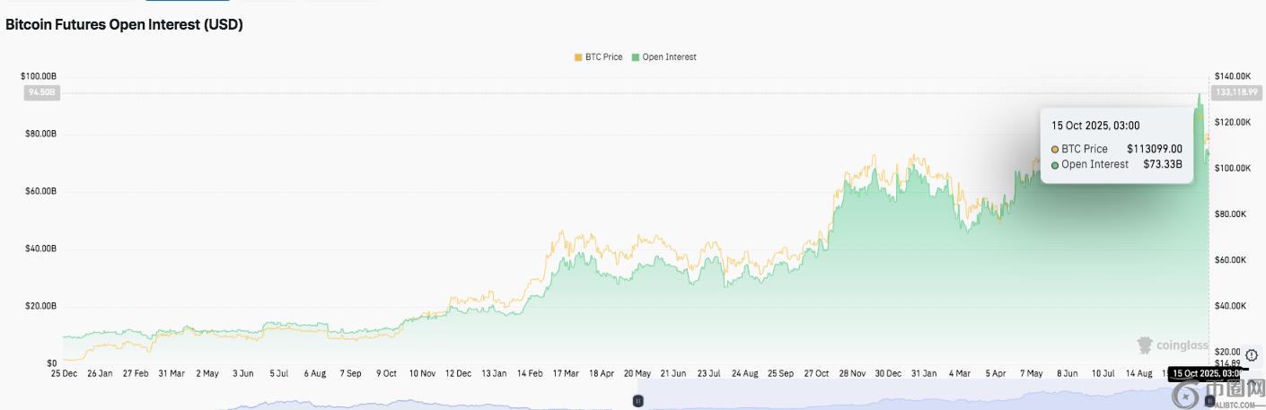 除了现货市场走势之外,比特币衍生品市场的投机兴趣也急剧上升。比特币期货的未平仓合约已飙升至733.3亿美元,创下2025年初以来的**水平之一。这一增长模式与以往周期中大幅上涨之前的模式相似,表明机构投资者的参与度和杠杆仓位有所提升。