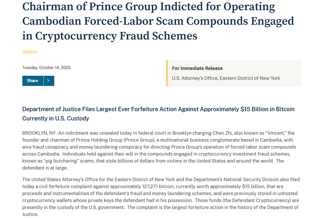 **部宣布周二,该公司对价值约 144 亿美元的 127,271 枚比特币提起了没收诉讼,这些比特币目前由美国政府保管。这些比特币与柬埔寨太子控股集团创始人兼董事长陈志有关,陈志被控策划大规模“猪屠宰 ”加密投资计划。