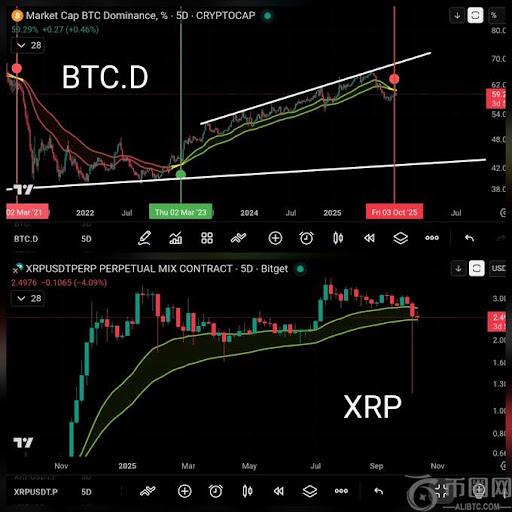 加密货币分析师 CoinsKid 最近共享**消息确认,备受期待的 XRP 第四季度举措仍是一个潜在选择。这一乐观前景在很大程度上得到了当前观察到的数据的支持。比特币主导地位 (BTC.D) 图表,分析师认为这是山寨币表现的关键晴雨表。如果 BTC.D 表现**,资本通常会流入 XRP 等资产,从而支撑未来几个月大幅上涨的可能性。