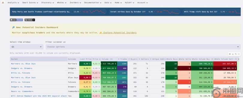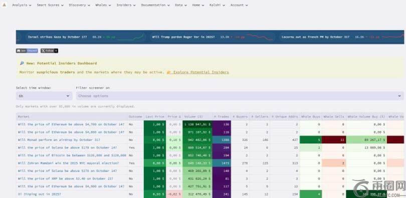 Hashdive(dot)com:另一个强大的分析平台。每个市场页面都包含深度指标,以及一个新的「内部人士」部分,可帮助你识别潜在的内幕交易者。
