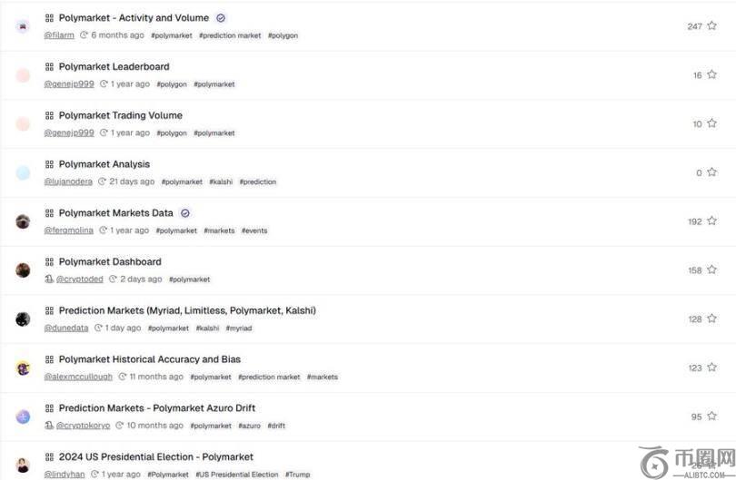 Dune Dashboards:数十个 Polymarket 仪表板,一些是全局性的(交易量、用户、交易),其他是专业性的(内部人士、空投追踪器、巨鲸等)。