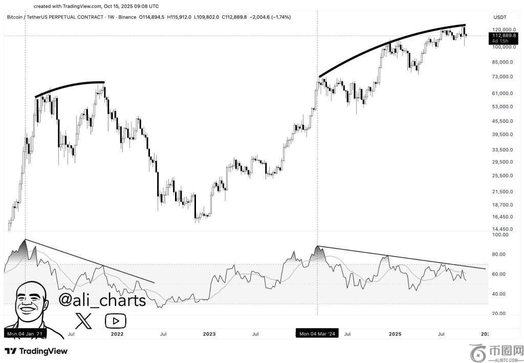 分析师分享的图表阿里突显了比特币当前价格结构与其2021年市场高点之间的惊人相似性。数据显示,尽管比特币价格不断创下新高(目前已达到115,900美元附近的峰值),但周线图上的相对强弱指数(RSI)却不断创下新低,形成了明显的看跌背离。这表明,即使价格上涨,买盘动能也在减弱,这通常是潜在趋势逆转或市场回调的先兆。