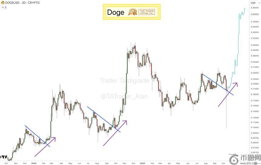 此外,在 3 日图上,交易员 Tardigrade 观察到类似于以往看涨周期的累积突破模式。如果狗狗币能够守住 0.20 美元的关键支撑位,价格动能可能会延续至 0.35 美元甚至 0.50 美元,显示出市场对潜在持续上涨保持乐观态度。
