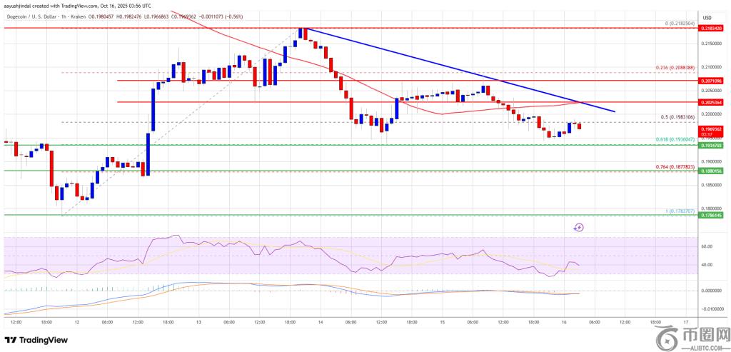DOGE 价格开始在 0.2050 美元以下进行新一轮下行修正。 价格低于 0.240 美元水平和 100 小时简单移动平均线。 DOGE/USD 对的小时图上形成了一条看跌趋势线,阻力位在 0.2025 美元(数据来源于 Kraken)。 如果价格保持稳定在 0.1880 美元以上,则可能再次上涨。狗狗币价格再次下跌