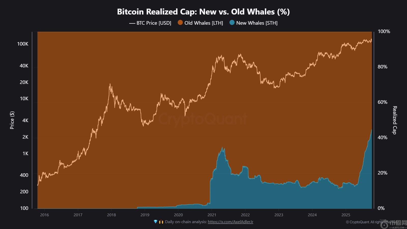 链上数据显示,短期持有比特币的巨鲸最近将其实际市值份额提升至历史**水平。