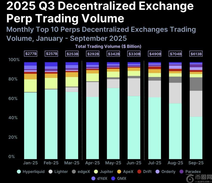 去**化永续交易所(Perp DEX)也出现了惊人的增长,共处理了1.8万亿美元的交易,较第二季度增长了87%。虽然Hyperliquid仍占据超过一半的市场份额,但Aster、Lighter和edgeX等新兴平台正在迅速追赶。仅Aster一家,9月份的日交易量就突破了848亿美元。