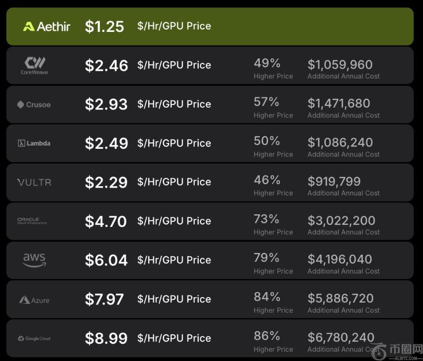 Aethir 真正的业务竞争对手是 Web 2 的**化计算和云服务企业,而其**的优势便是具有竞争力的定价,“举个例子,现在,像我们平台上的价格,与 AWS 的价格相比,大约是 AWS 的 1/10”。如下图所示,Aethir 的每小时 GPU 报价虽然要明显低于谷歌、AWS 和 Oracle,但其同样具备大规模 LLM 训练和云游戏渲染的企业级计算资源条件。