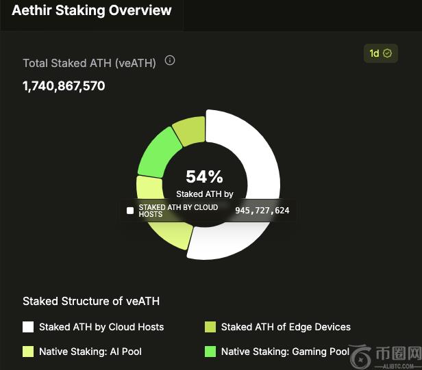 Aethir 网络 GPU 算力扩展,也就意味着会有更多 Aethir 被质押。根据 Aethir 的 GPU Dashboard 数据,目前已有超 17.4 枚 ATH 被质押,其中云主机占比其中 54%。