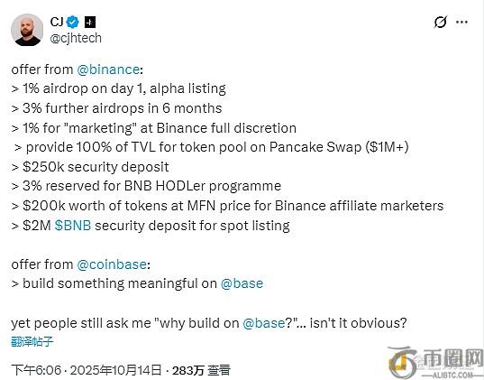 “注意到2025年10月14日由CJ发布的帖子,其中包含针对币安的虚假和诽谤性指控。这些指控显然旨在误导社区并损害币安上币流程的公正性。 1. 币安不会从其上市过程中获利——**分配是针对币安用户的。币安不收取上币费,但需要缴纳保证金以保护用户权益。 2. 关于币安及其创始人抛售**的指控**不真实且没有根据。 3. 对CJ非法披露机密沟通内容的行为表示震惊,币安保留采取法律行动的权利。”