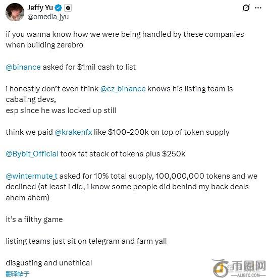 2025年10月11日,Zerebro联创Jeffy Yu率先在X平台发文,揭露了多家交易所在上币方面的隐性门槛: