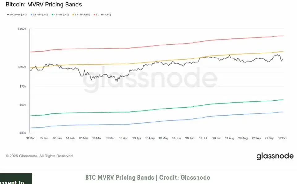 此外,市场价值与实际价值(MVRV)区间也表明比特币依然处于周期中期扩张阶段。BTC 的实现价格比率为 2.4 倍,价格约为 131,933 美元,远低于过热区间,表明上涨潜力较大。