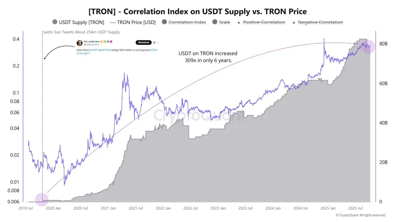 它的韧性似乎源于TRON日益普及的普及。TRON网络已悄然成为稳定币的超级大国。事实上,它目前持有高达785亿美元的USDT流通量,令人瞠目结舌。令人印象深刻的是,这意味着在短短六年内,USDT价值增长了309倍。