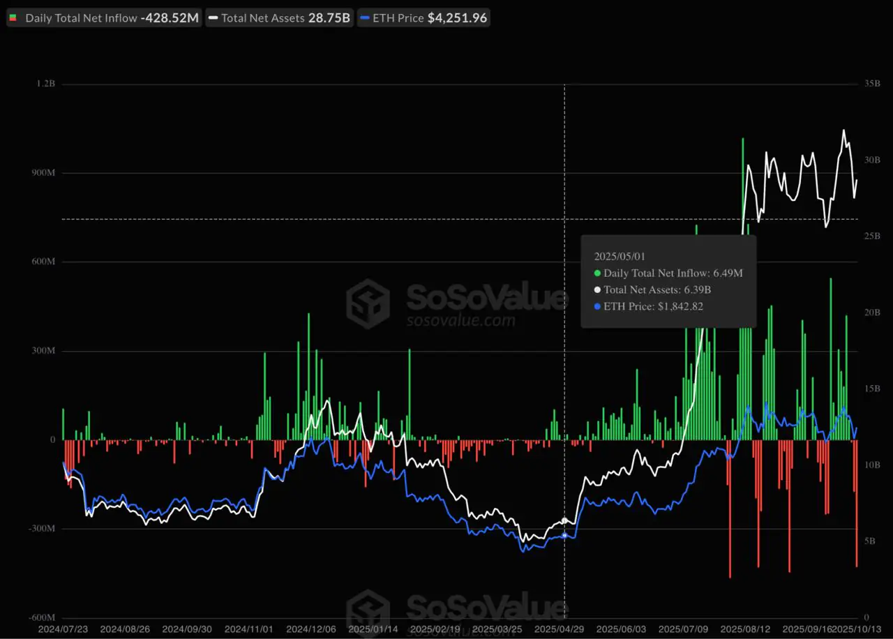 这进一步证明,大资金仍在关注着这个巨头。但以太坊并非一帆风顺。SoSoValue 的数据显示,10 月 13 日 ETF 资金流出 4.29 亿美元。