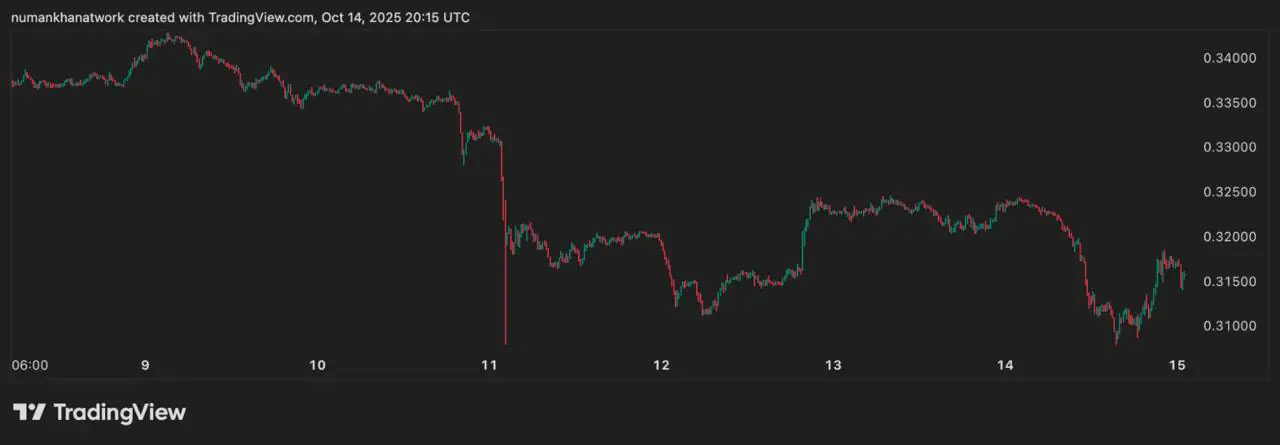 2025年10月11日,那个决定命运的日子,大多数山寨币都暴跌了。但相比之下,TRX却几乎毫发无损。在如此灾难性的市场崩盘中,从0.324美元跌至0.307美元,听起来几乎令人印象深刻。TRX 价格现已回升至 0.315 美元。这再次证明了TRON的实力。