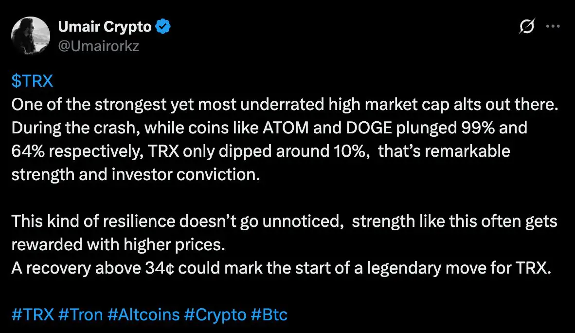 即使在ATOM和DOGE暴跌的血腥屠杀中,TRX也仅下跌了不到10%。分析师Umair 加密货币现在表示突破 0.340 美元可能会引发“传奇举动”。
