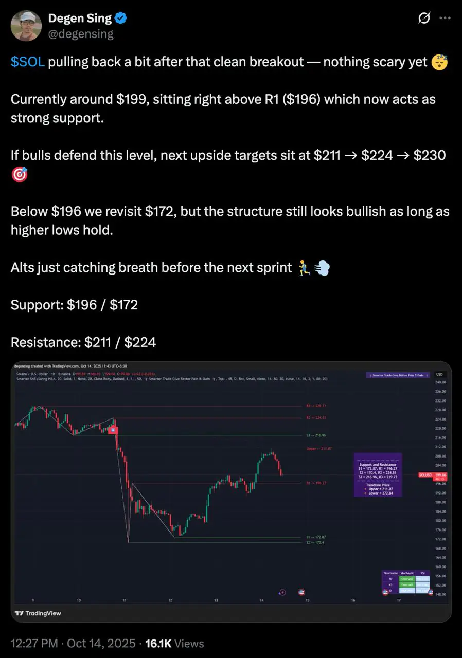 市场分析师德根·辛相信该结构仍然看涨。该分析师指出,如果买家守住196美元,下一个目标位将是211美元、224美元和230美元。跌破196美元可能会重新测试172美元。但趋势仍然有利于多头。