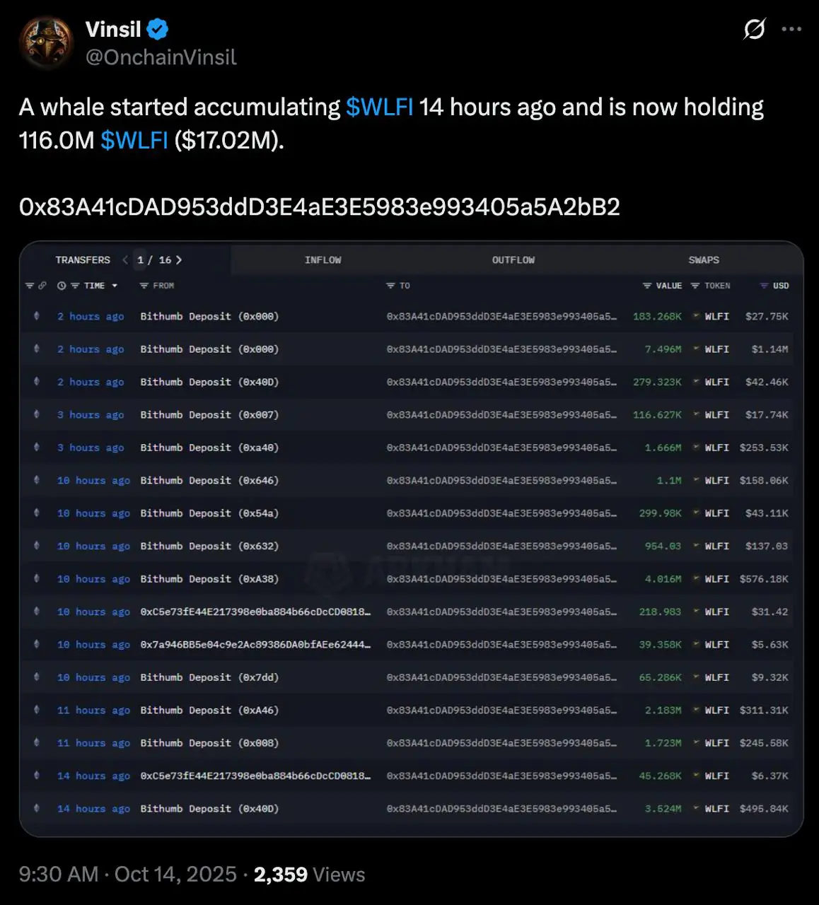 鲸鱼在价格暴跌和团队回购后积累 WLFI
