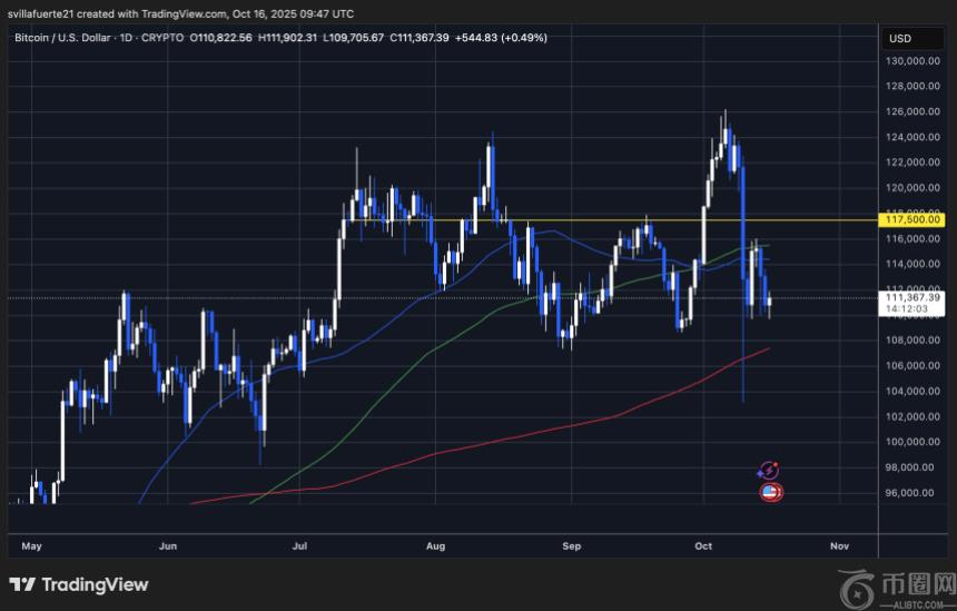 比特币继续徘徊在111,300美元左右,在上周暴跌至103,000美元附近后,显示出韧性。图表显示,BTC目前正在11万美元支撑位上方盘整,这一关键区域在过去的回调中曾多次充当短期底部。