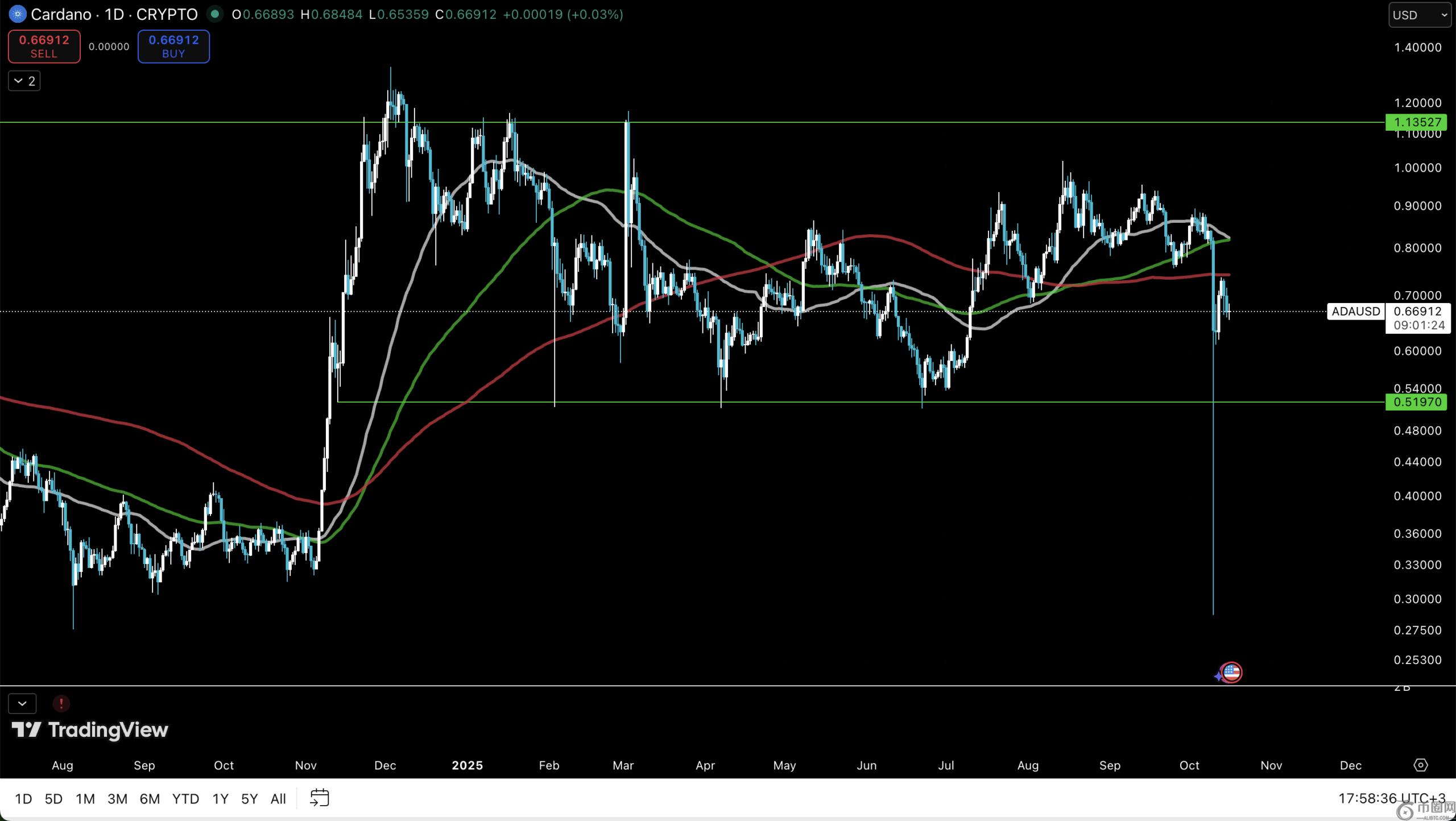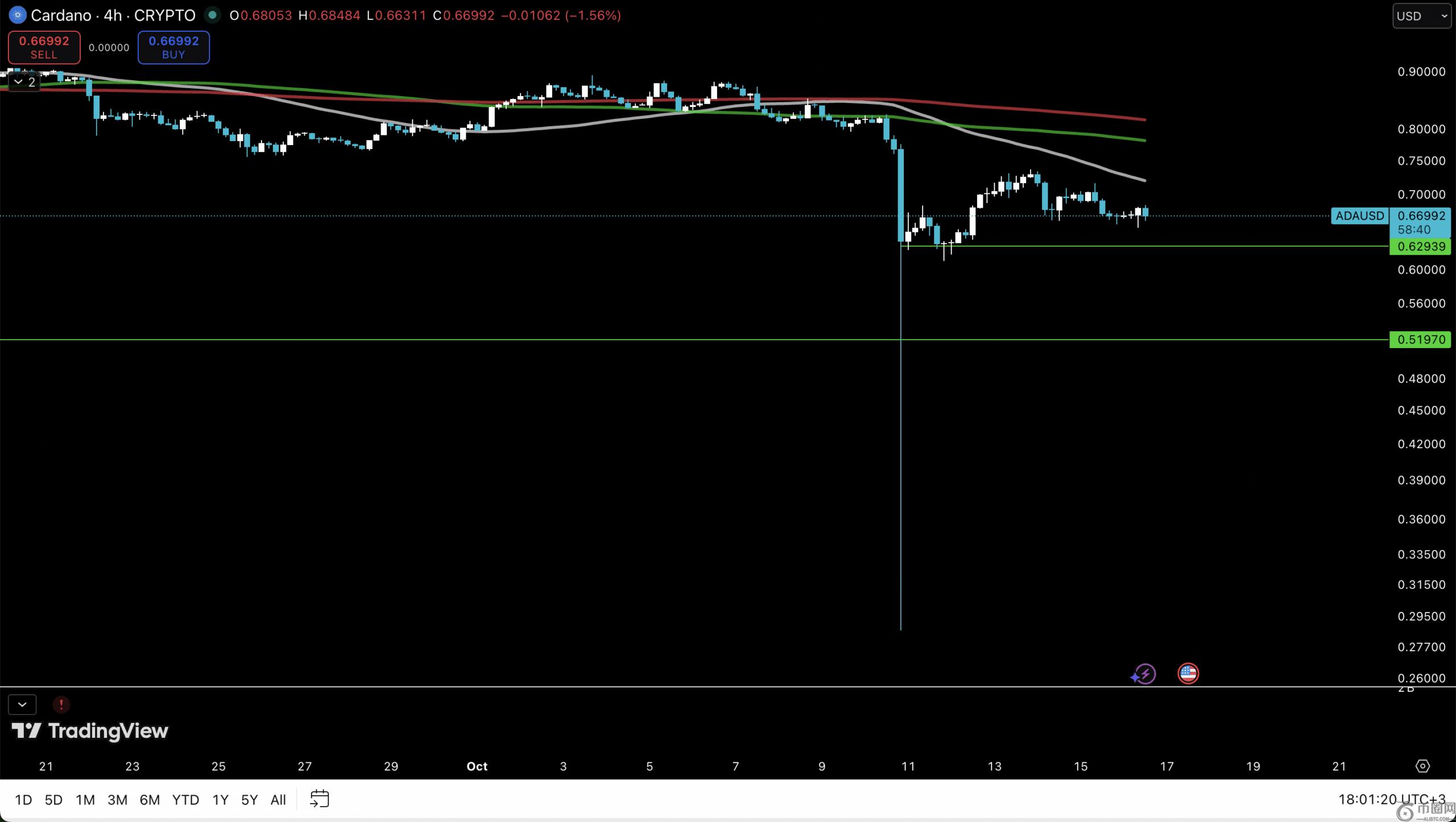**,我们将分析4小时时间框架。与ADA过去较小的波动幅度相比,这条长长的影线显得有些荒谬。尽管此次下跌发生在Cardano价格跌破所有移动平均线之后。目前,0.63美元的支撑位正在形成。问题是,它能否守住并**收复移动平均线,还是会重新测试0.52美元?目前来看,这仍是一场等待的游戏。