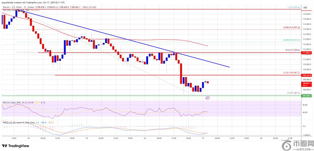 价格甚至跌破了 108,000 美元。**点形成于 107,483 美元,目前价格正在巩固跌幅,跌幅低于近期从 115,975 美元的波动高点跌至 107,483 美元低点的 23.6% 斐波那契回撤位。