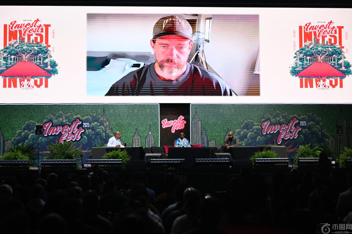 2025 年 8 月 23 日,在佐治亚州亚特兰大佐治亚世界会议**举行的 2025 年投资节第二天,拉沙德·比拉尔 (Rashad Bilal)、伊恩·邓拉普 (Ian Dunlap) 和特洛伊·米林斯 (Troy Millings) 在舞台上,杰克·多尔西 (Jack Dorsey) 则以虚拟方式向与会者发表讲话。