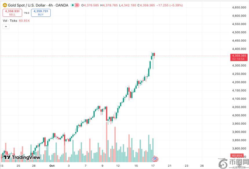 根据 TradingView 的数据,2025 年 10 月 16 日,黄金价格飙升至每盎司 4,380 美元,创下历史新高。Companies MarketCap 的数据显示,黄金的总市值已达到约 30.38 万亿美元,进一步巩固了其作为全球主导避险资产的地位。经济时报.