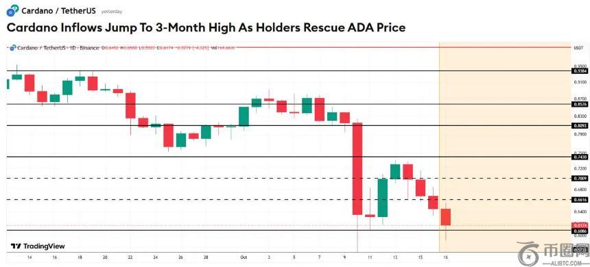 根据交易视图(TradingView)的数据,尽管近期资金流入达到三个月高点,卡尔达诺未能突破0.74美元的阻力位,并在跌破0.66美元后继续下行至0.62美元附近。**分析师Dan Gambardello表示,这一下跌趋势符合他对卡尔达诺看跌前景的预期。