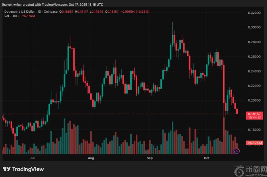从技术上讲,DOGE正在测试0.17-0.19美元附近的关键支撑位,该支撑位是多位分析师指出的数周通道的下限。守住该区域可能推动价格反弹至0.21-0.23美元,本月的每次反弹都受到密集的移动平均线和先前的供应限制。