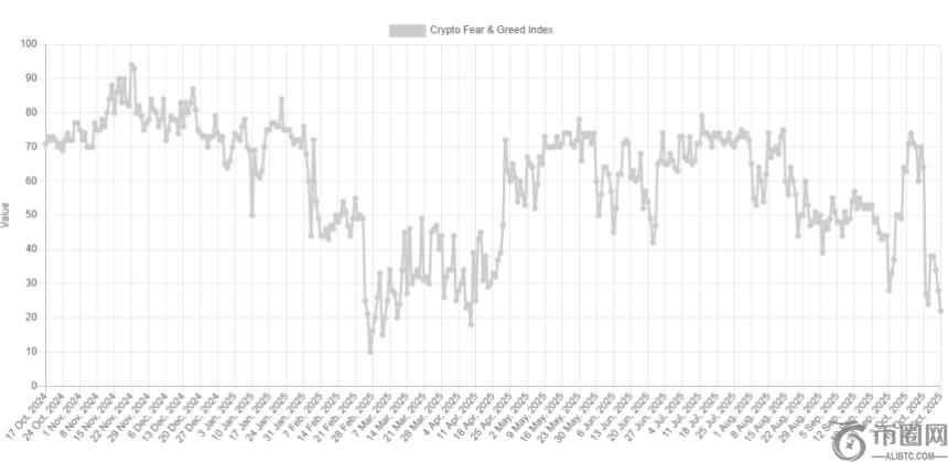 随着比特币和其他资产的崩盘,加密货币恐惧与贪婪指数已跌**度恐惧区域。