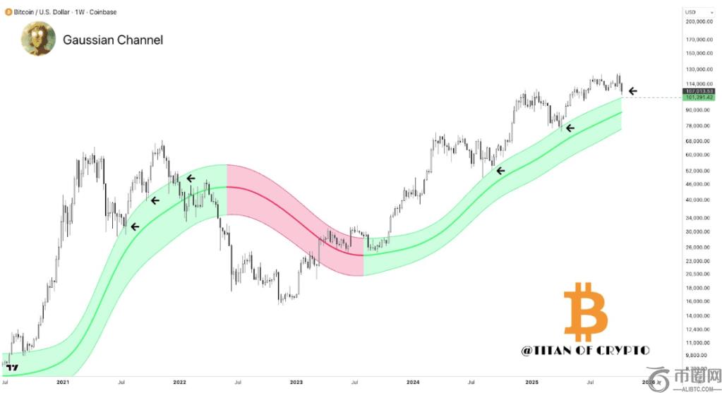 Titan of Crypto 注意到比特币位于高斯通道上方,代表长期趋势强劲。如下方的周线 K 线价格图所示,绿色通道对应看涨阶段,红**域则代表看跌下跌,典型的例子是 2022 年的熊市。