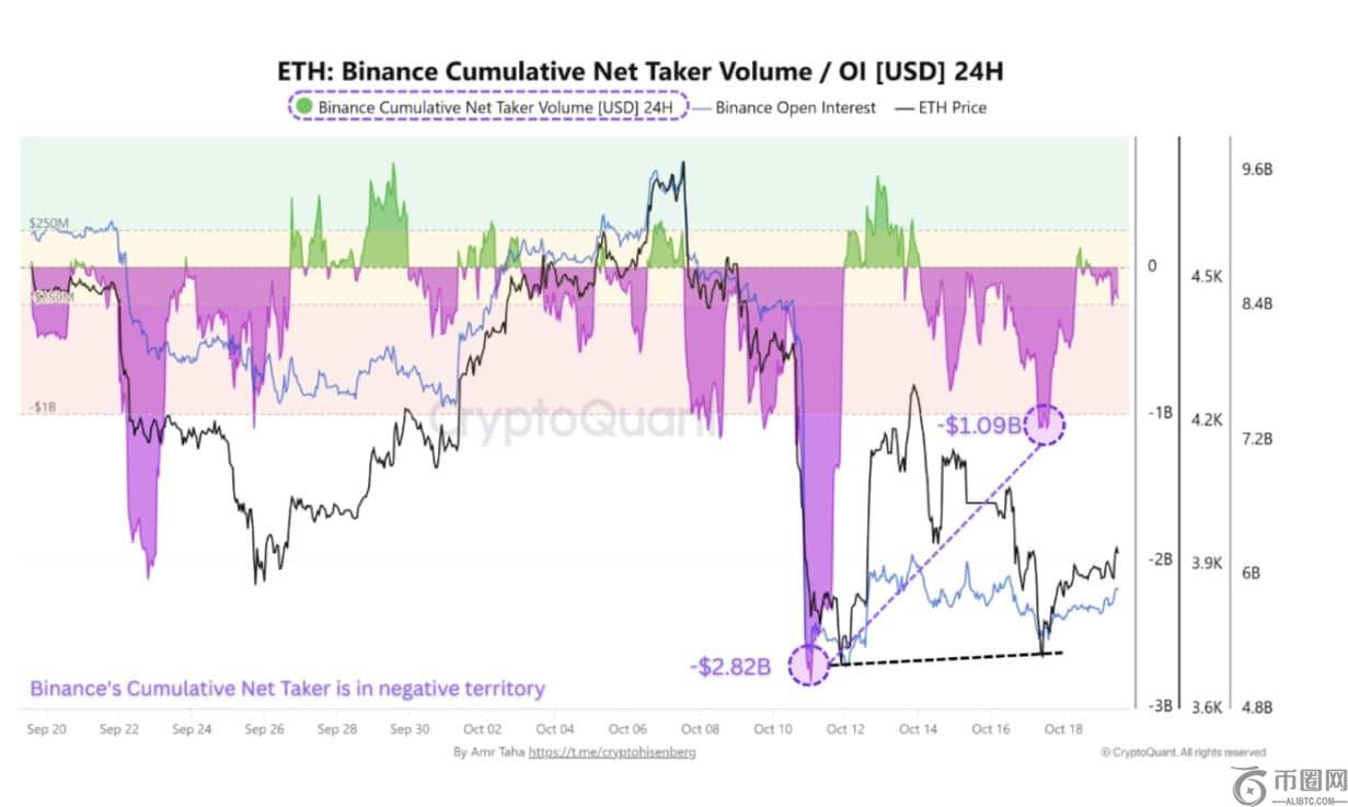 具体来说,在10月11日的崩盘期间,净接受者交易量跌至-28.2亿美元。此后,净接受者交易量已回升至-19亿美元,显示出卖家**的早期迹象。