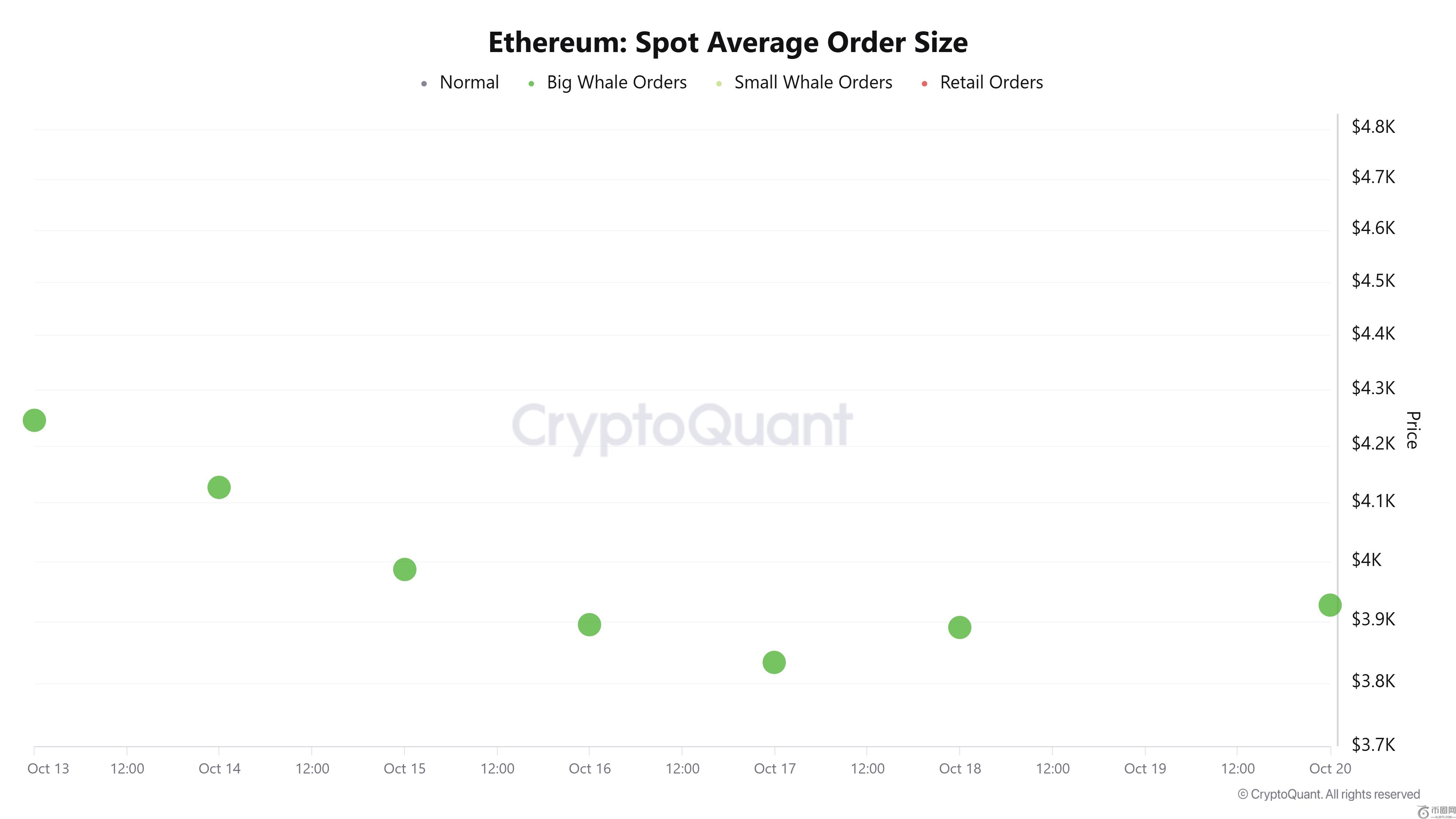 随着卖家逐渐精疲力竭,买家纷纷涌入市场填补这一缺口。CryptoQuant 的现货平均订单规模数据就证明了这一点,这些买家大多是“鲸鱼”。