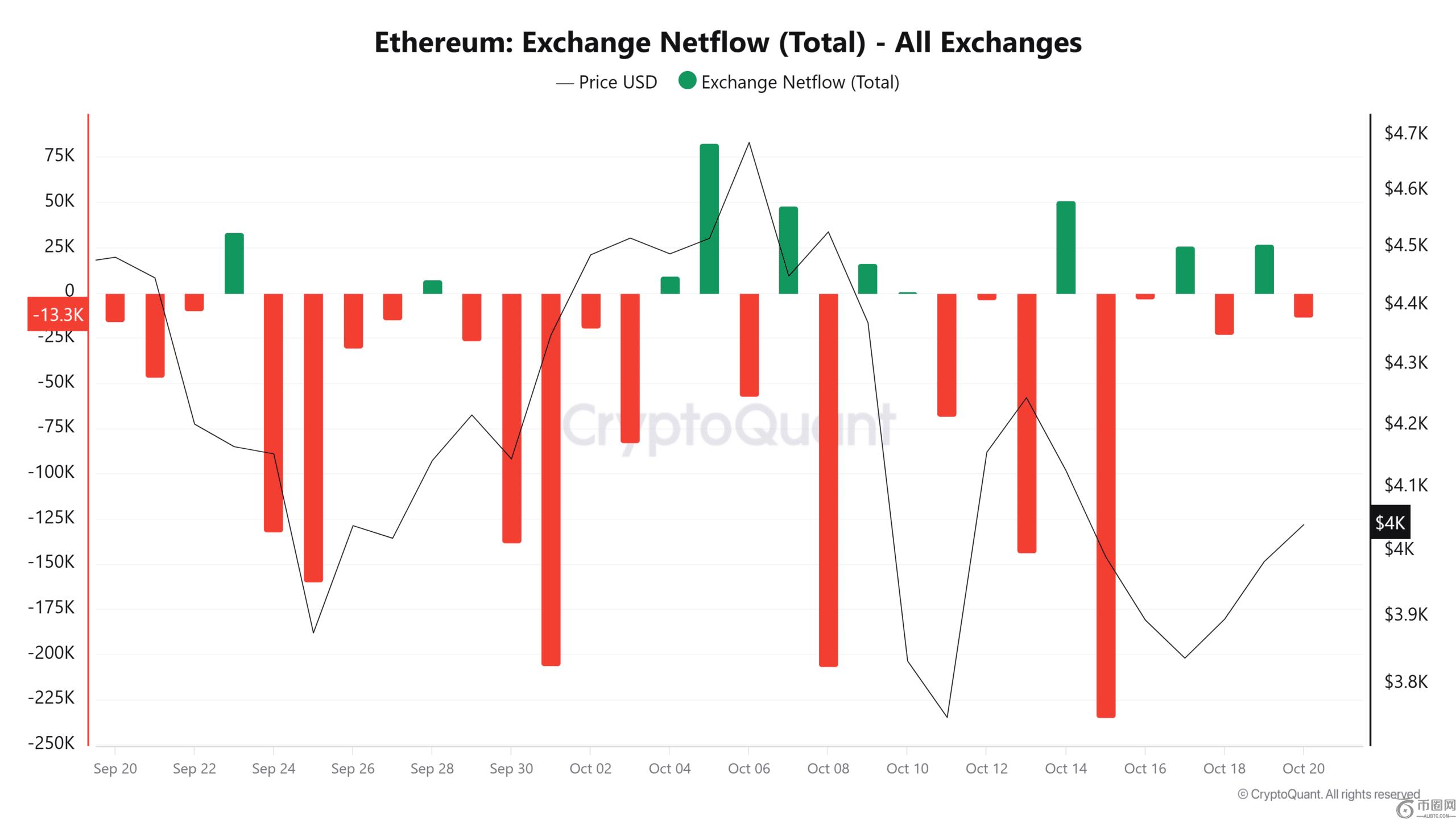由于鲸鱼增加购买量,以太坊上涨 4.82%,交易所净流量变为负值(-13.3K ETH),卖家疲惫预示着看涨背离。