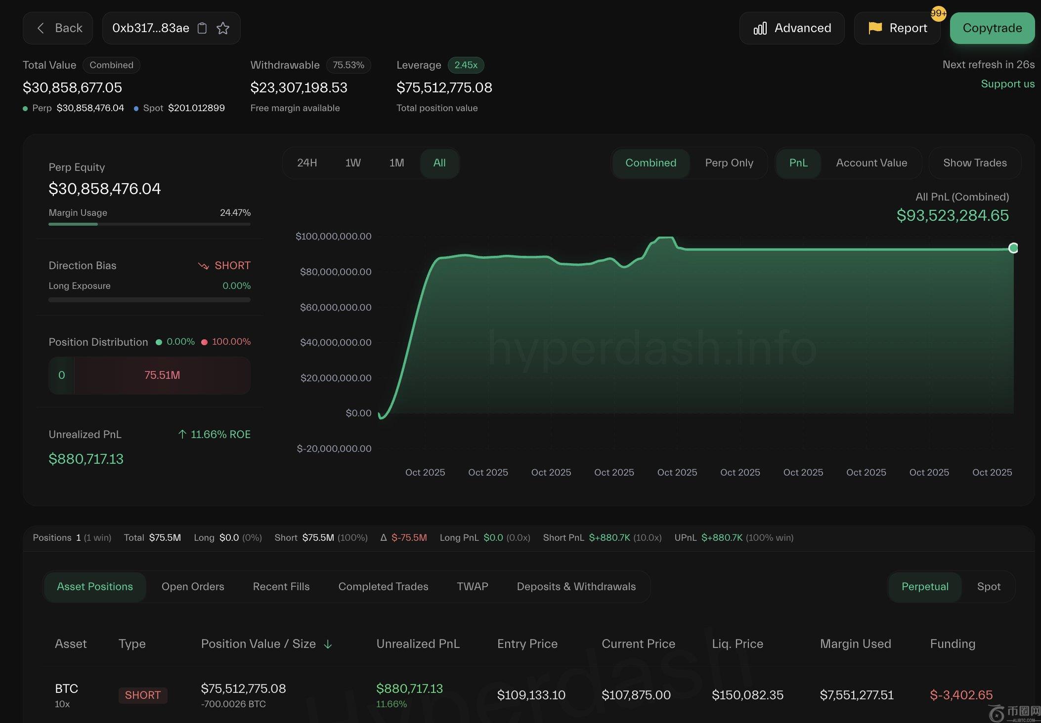 这位名为 BitcoinOG (1011short) 的交易员,因在上周的闪电崩盘中获利超过 1.97 亿美元而闻名,如今又重操旧业了。链上数据显示,他已向 Hyperliquid 存入了价值 3000 万美元的 USDC,并建仓 700 BTC 的 10 倍空头仓位,价值约 7550 万美元。