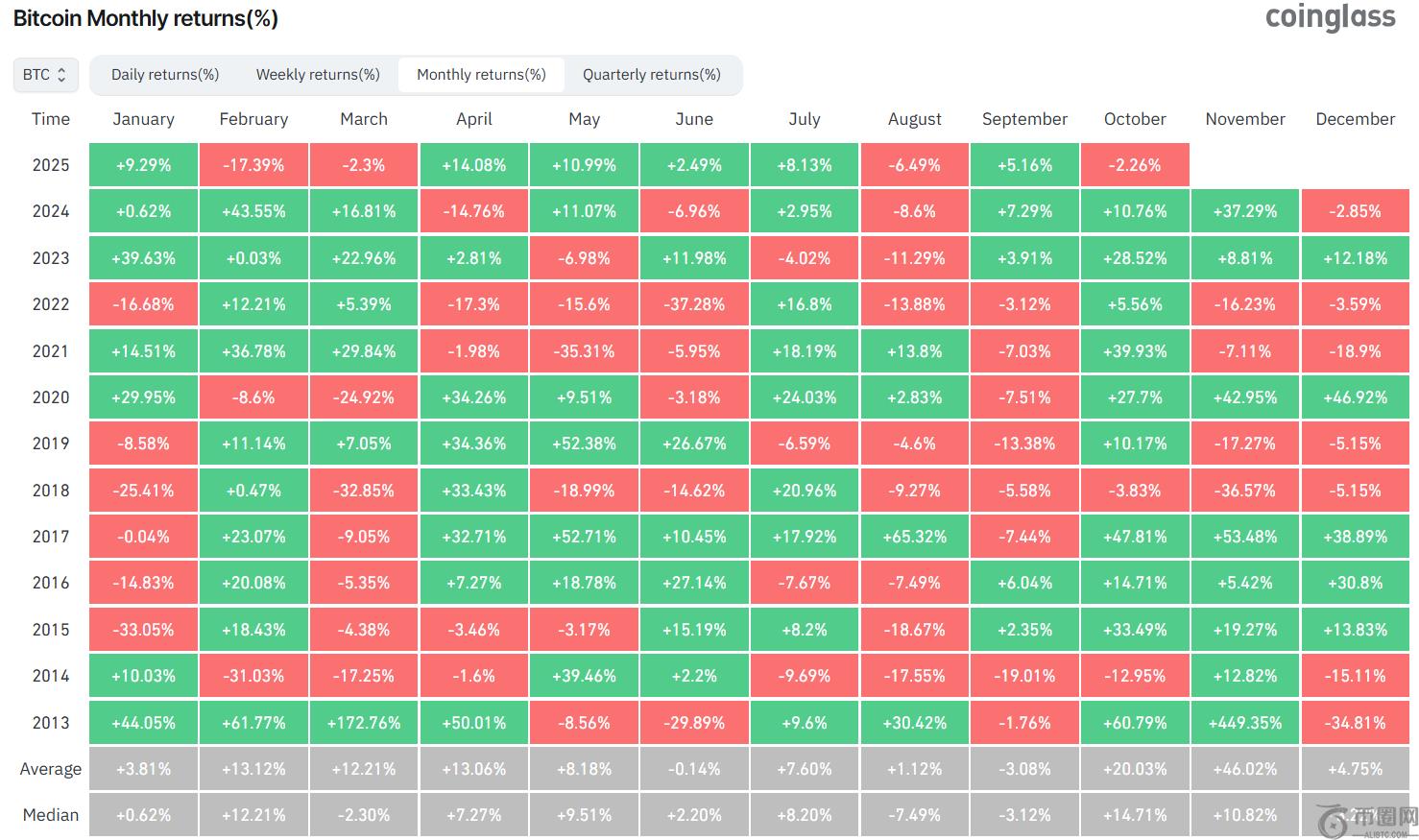 比特币在过去24小时内上涨了1.75%,此前触及107,452美元附近的低点。整体加密货币市场已从2019年以来最糟糕的10月份表现中回升。迄今为止,市场表现超出了历史月度预期:交易员们经历了一个令人意外的“上涨十月”,如今又经历了一个令人沮丧的“红色十月”。
