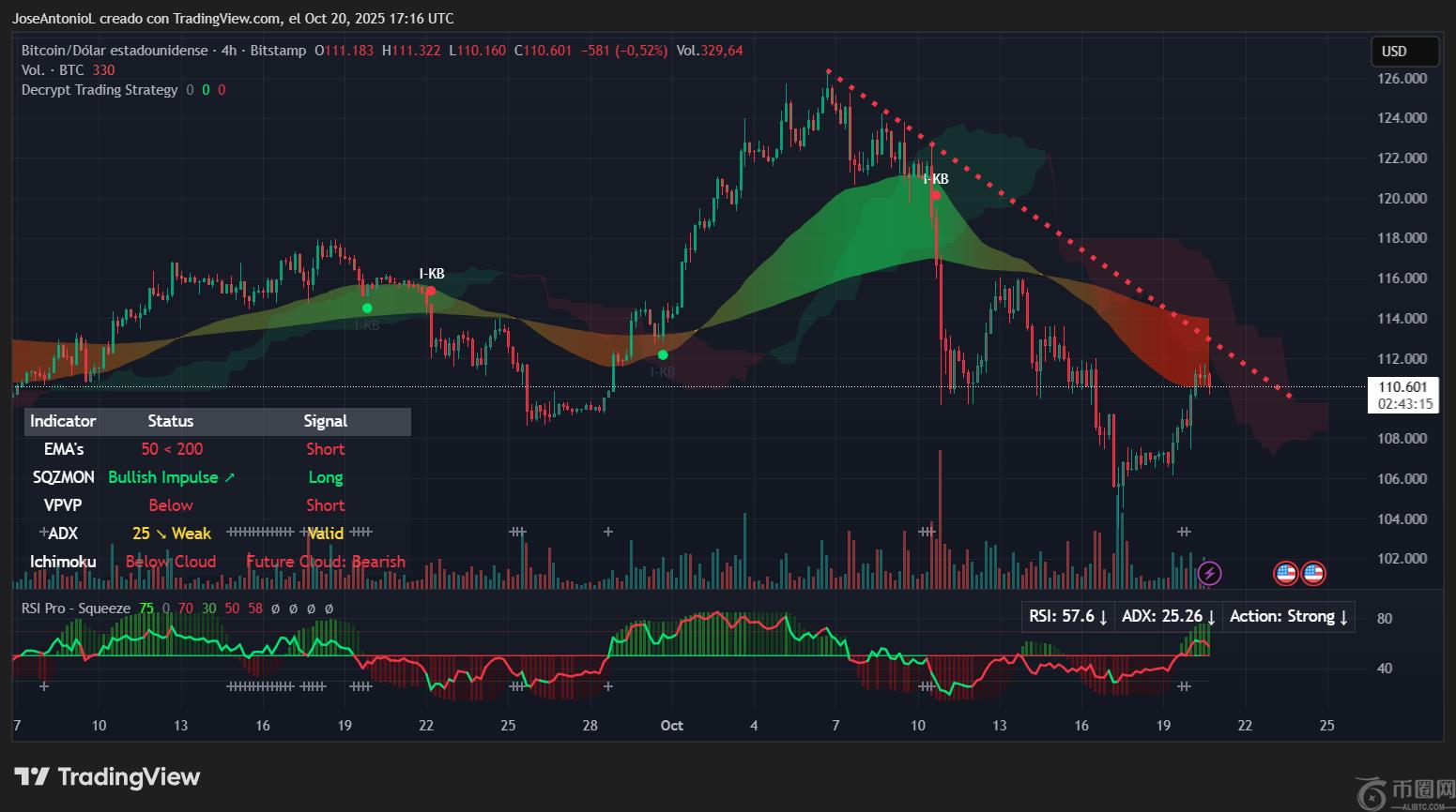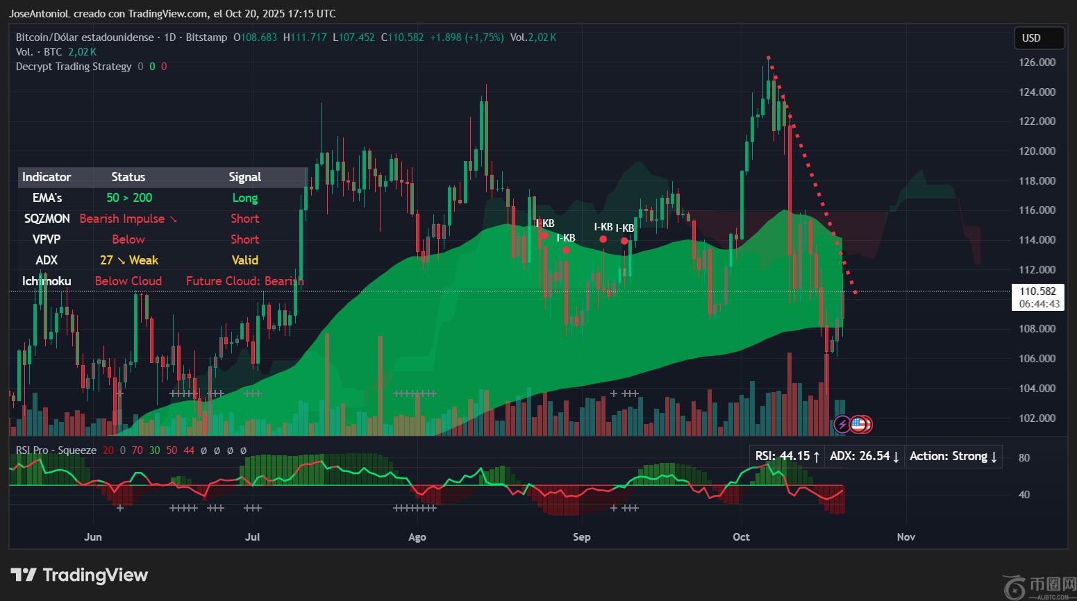 令人不安的事实是:技术面确实存在分歧,这也解释了为什么预测市场的**如此不稳定。日线图的看跌形态(RSI 44,看跌挤压,低于云层)表明,10万美元仍然是近期更有可能的目标价。但四小时图的看涨背离(RSI 57,看涨挤压)以及长期EMA50高于EMA200的走势表明,在真正上涨之前,**跌向10万美元的走势都可能是一个熊市陷阱。