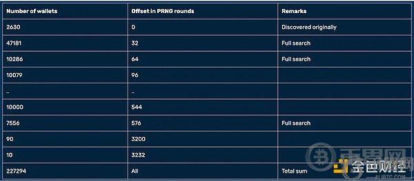 根据团队的进一步深入分析,2023 年最初发现的 2,630 个问题钱包仅仅是整个冰山的一角。通过在 PRNG 输出的不同区段进行搜索,研究者现已成功重构并识别出超过 227,200 个独立钱包(如下图所示),这些钱包均在主网上存在有效使用记录,构成了迄今为止规模**的「弱随机钱包」群簇。