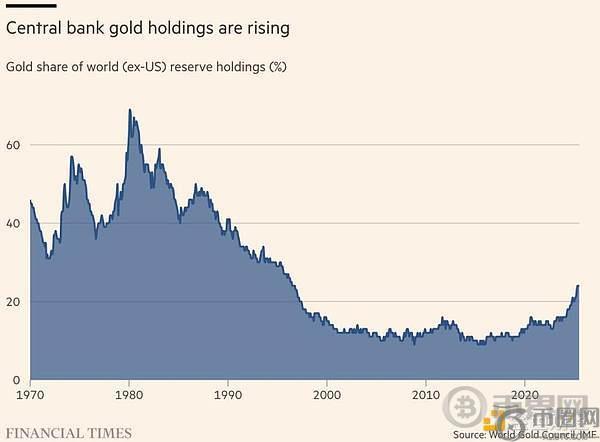 如此表现(尤其是近11个月)推动央行黄金储备占比显著攀升。Charlie写道:"黄金现占全球央行储备20%以上,为近三十年来的**份额。"