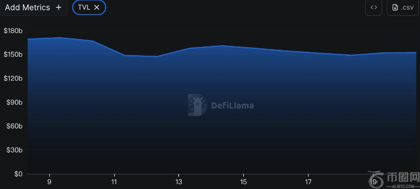 据 DeFiLlama 的数据,本周 DeFi 总 TVL 为$1,522 亿,较上周 1,574 亿,下降约 3.3%。