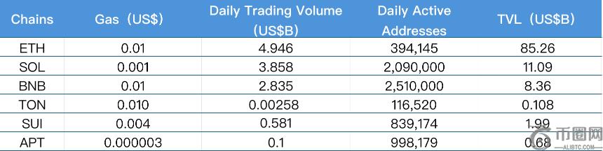 主要从日交易量、日活跃地址、交易费用分析目前主要 Layer1 含 ETH、SOL、BNB、TON、SUI 以及 APTOS 的相关数据。