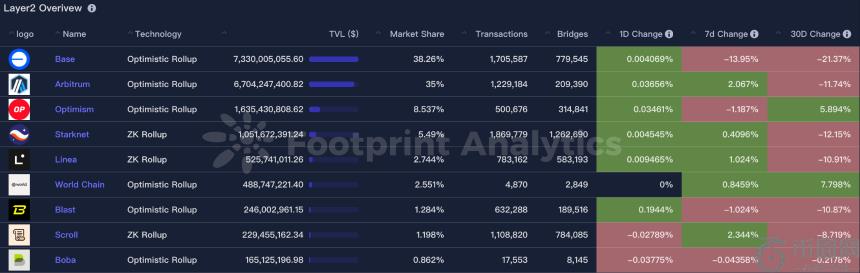 Base 和 Arbitrum 分别以 38.26% 和 35% 的市场份额占据前排,Base 链过去一周市场份额略有下降,Arbitrum 略有上升。