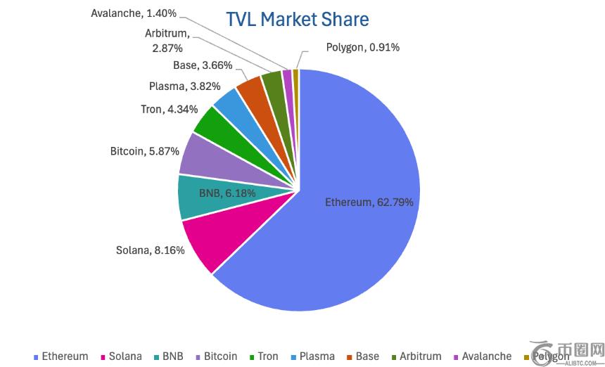 按公链进行划分,其中 TVL **的三条公链分别是 Ethereum 链,占比 62.79%;Solana 链,占比 8.16%;BNB Chain,占比 6.18%。