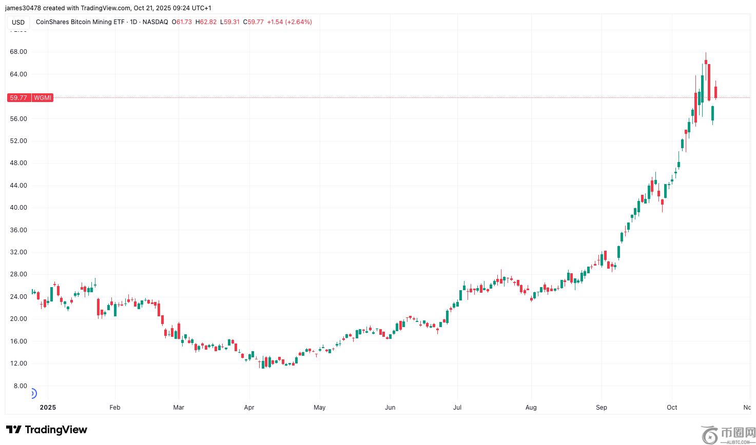 CoinShares 比特币挖矿 ETF (WGMI) 通常被视为更广泛的比特币挖矿行业的代表,今年迄今已上涨 160%。