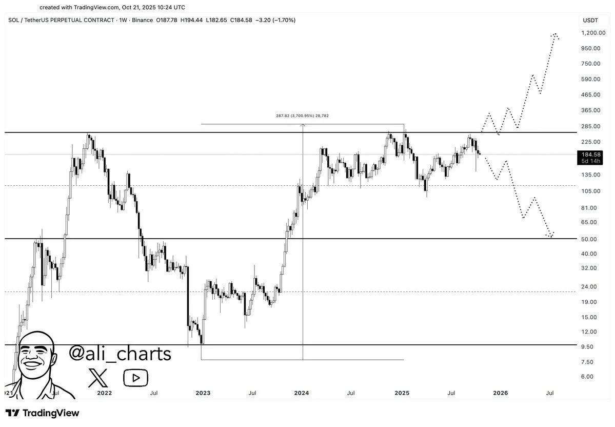 Solana 目前的交易价格接近184美元,24小时内小幅上涨0.16%,但周线下跌9.69%。分析师阿里·马丁内斯指出,Solana自2022年12月以来已飙升逾3700%,目前在225美元至250美元之间面临阻力。他预计,突破该区域可能推动价格升至365美元甚至更高。