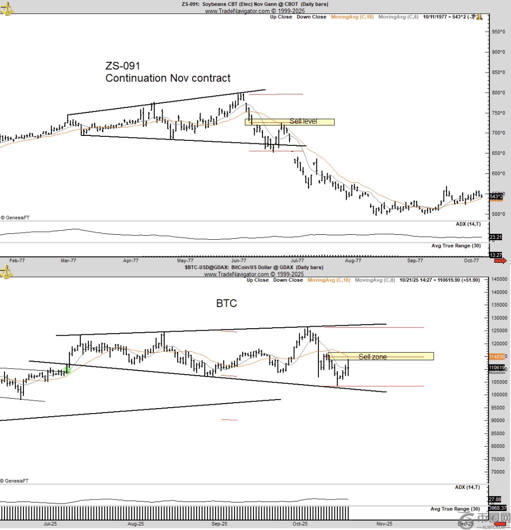 资深图表分析师彼得·布兰特 (Peter Brandt) 在发布了两张带注释的图表(一张是今天的比特币每日条形图,另一张是 1977 年芝加哥期货交易所的大豆图表)后,引发了关于 X 的新一轮技术争论,他认为加密货币可能正在形成一个类似于历史大宗商品在 50% 崩盘之前的形态的扩大顶部。