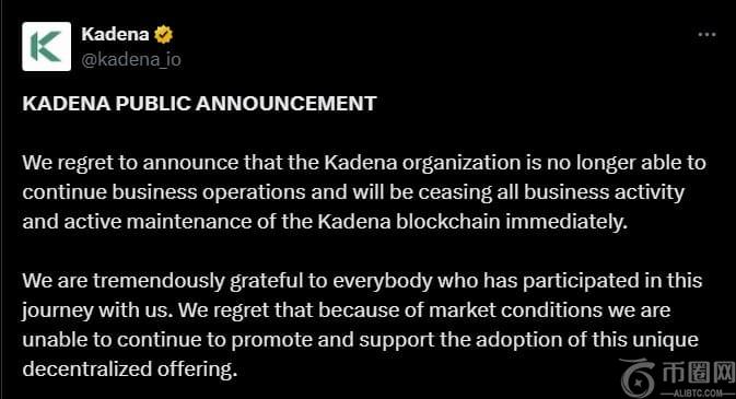 嘉手纳在一份官方声明中宣布“不再能够继续业务运营”,并“立即”停止所有公司活动和区块链的积极维护。