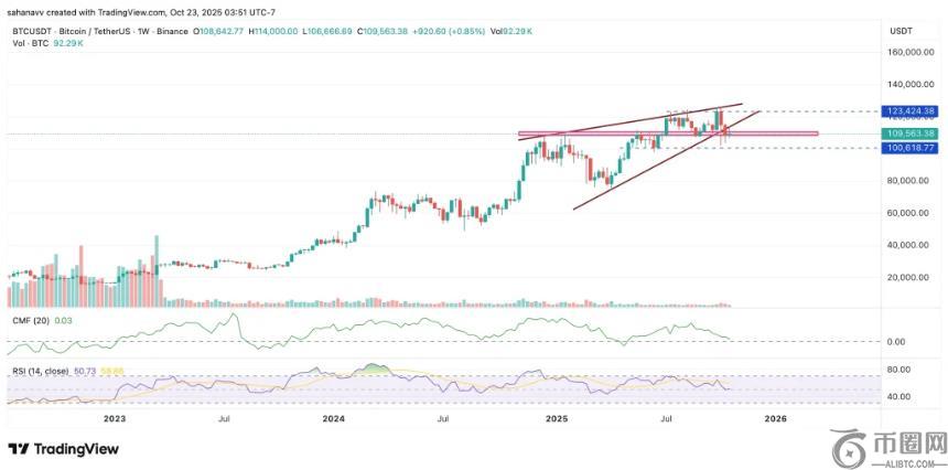 比特币 (BTC) 交易价格接近 109,500 美元,在上升楔形形态内盘整,暗示若支撑位失守,可能面临看跌压力。关键阻力位位于 123,400 美元,支撑位位于 100,600 美元。RSI (50.7) 显示中性动能,表明市场犹豫不决,而 CMF (0.03) 则表明资本流入**。持续突破 114,000 美元可能触发突破并创下新高,但收盘跌破 100,000 美元区域则可能确认跌破,并可能导致进一步下跌,之后再反弹。